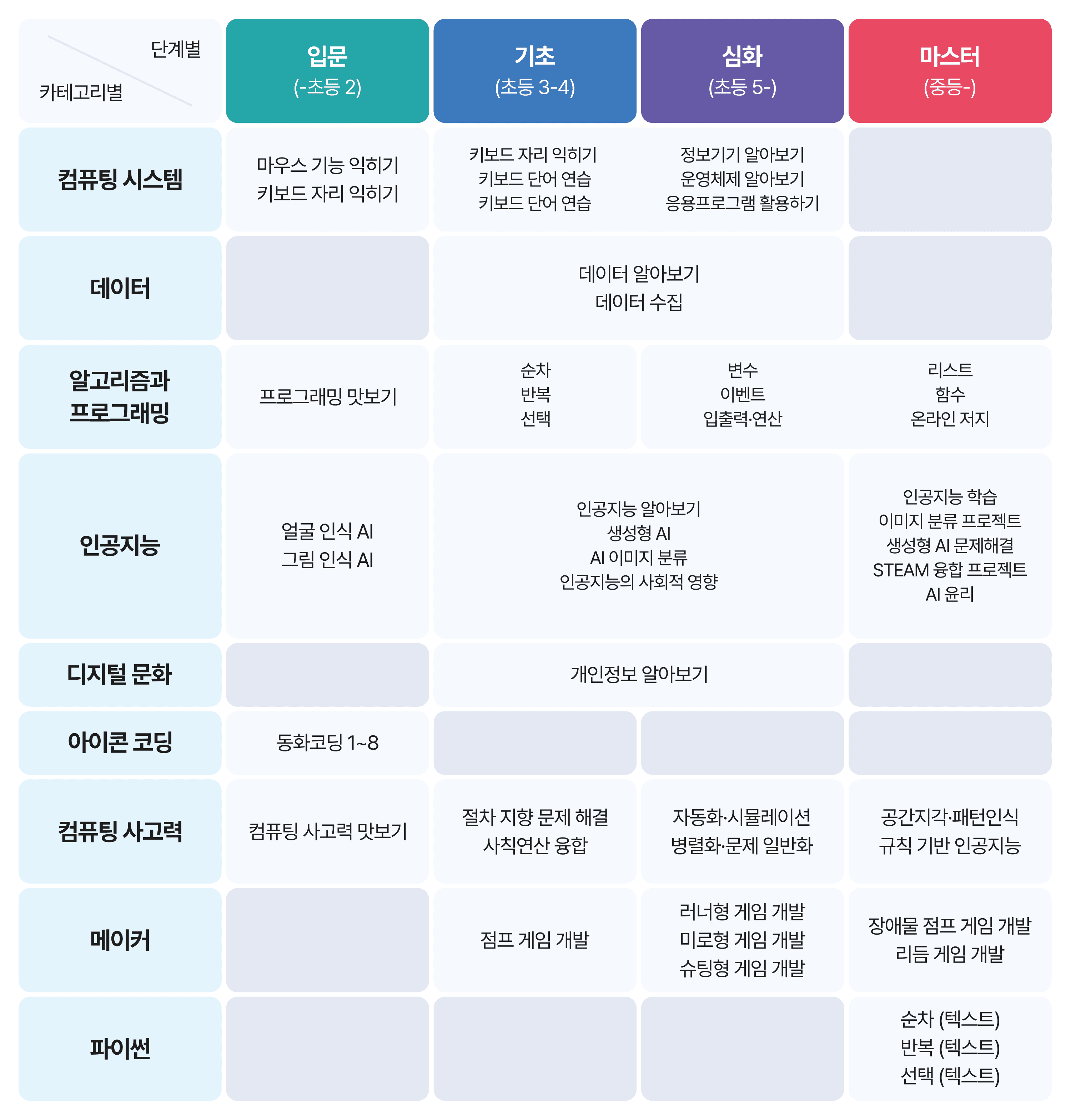 개념 학습부터 실습, 심화 과정까지 SW·AI 교육 전 과정이 하나의 흐름으로 유기적으로 연결됩니다. 코드모스는 스토리 기반 커리큘럼을 통해 학생의 단계적 성장을 지원합니다.